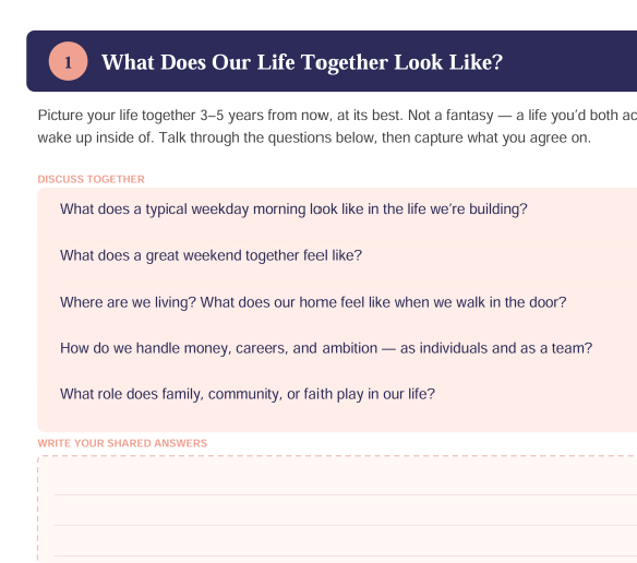 Get on the same page about the future you're building together — in 30 minutes.This guided written exercise gives you and your partner a clear, structured way to have that conversation.